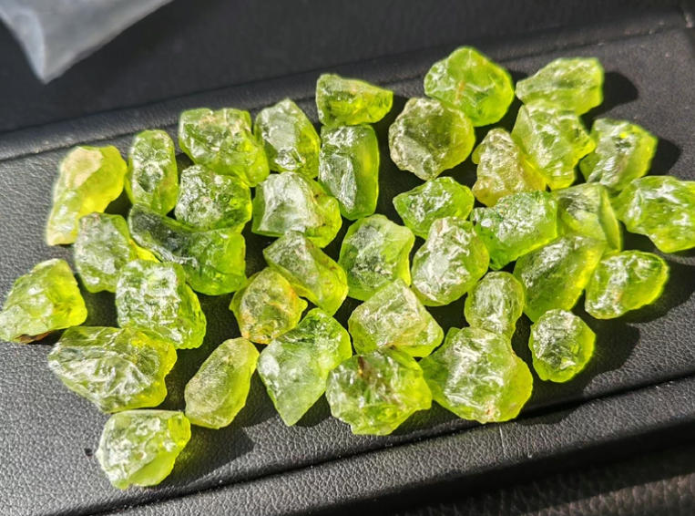 天然橄榄石原石,原矿原料,无注胶,无改色,无充填,晶体通透,颜色浓郁,颗粒都相当大颗完整,矿区直供。