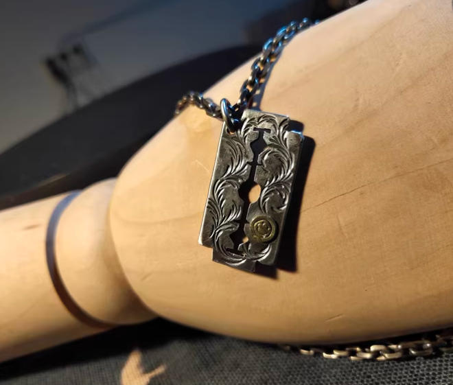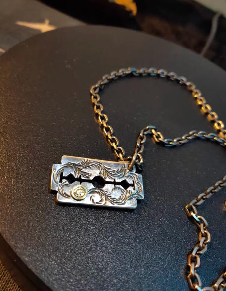 当复古唐草的缠绕感,遇上刀片轮廓的利落劲儿,再用一抹圆润笑脸中和冷硬——这枚吊坠从设计之初,就没想过随大流。